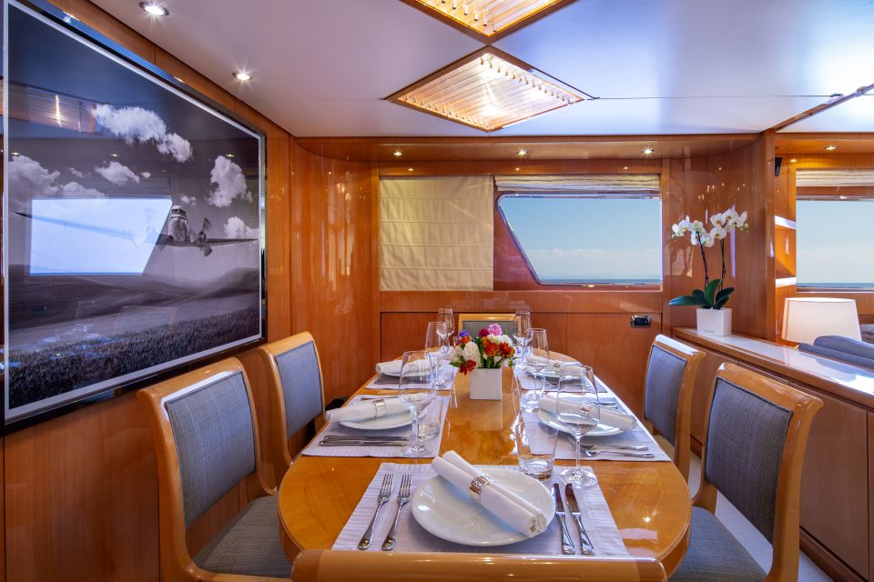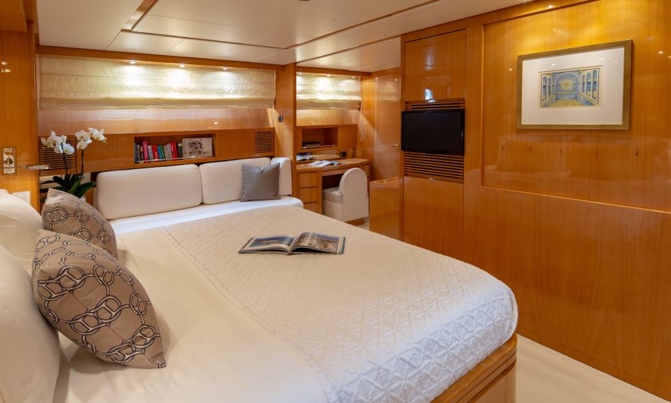 Featuring accommodation for 8 guests in 4 cabins with warm woods. She is a great example of quality and style, well equipped with all the amenities and with air conditioning throughout. She offers a multitude of living configurations, including the staterooms with an on-Deck Guest cabin forward the main deck, equipped with queen size bed and en-suite bathroom and shower.